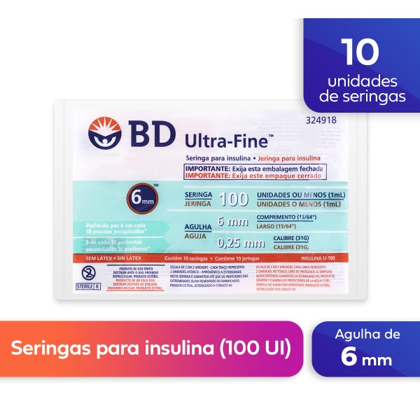 Seringa Insulina BD 1cc 6mm (pct. com10) - Capacidade para 100 unidades de insulina ou menos. Escala com graduação de 2 em 2 unidades, agulha com 6mm de comprimento e 0,25 de calibre (50G). Pacote com 10 unidades. Ideal para aplicação precisa de insulina, garantindo a segurança e o conforto do usuário. Desenvolvida para facilitar o manuseio e a dosagem correta do medicamento. Recomendável para pessoas que necessitam de controle rigoroso da glicemia, atuando na diabetes. Alta qualidade e confiabilidade, assegurando o uso eficaz do tratamento. Produto essencial para o dia a dia de quem convive com a diabetes.